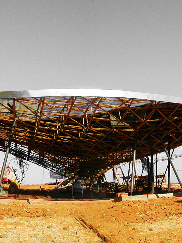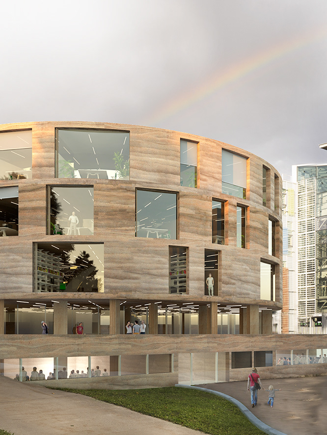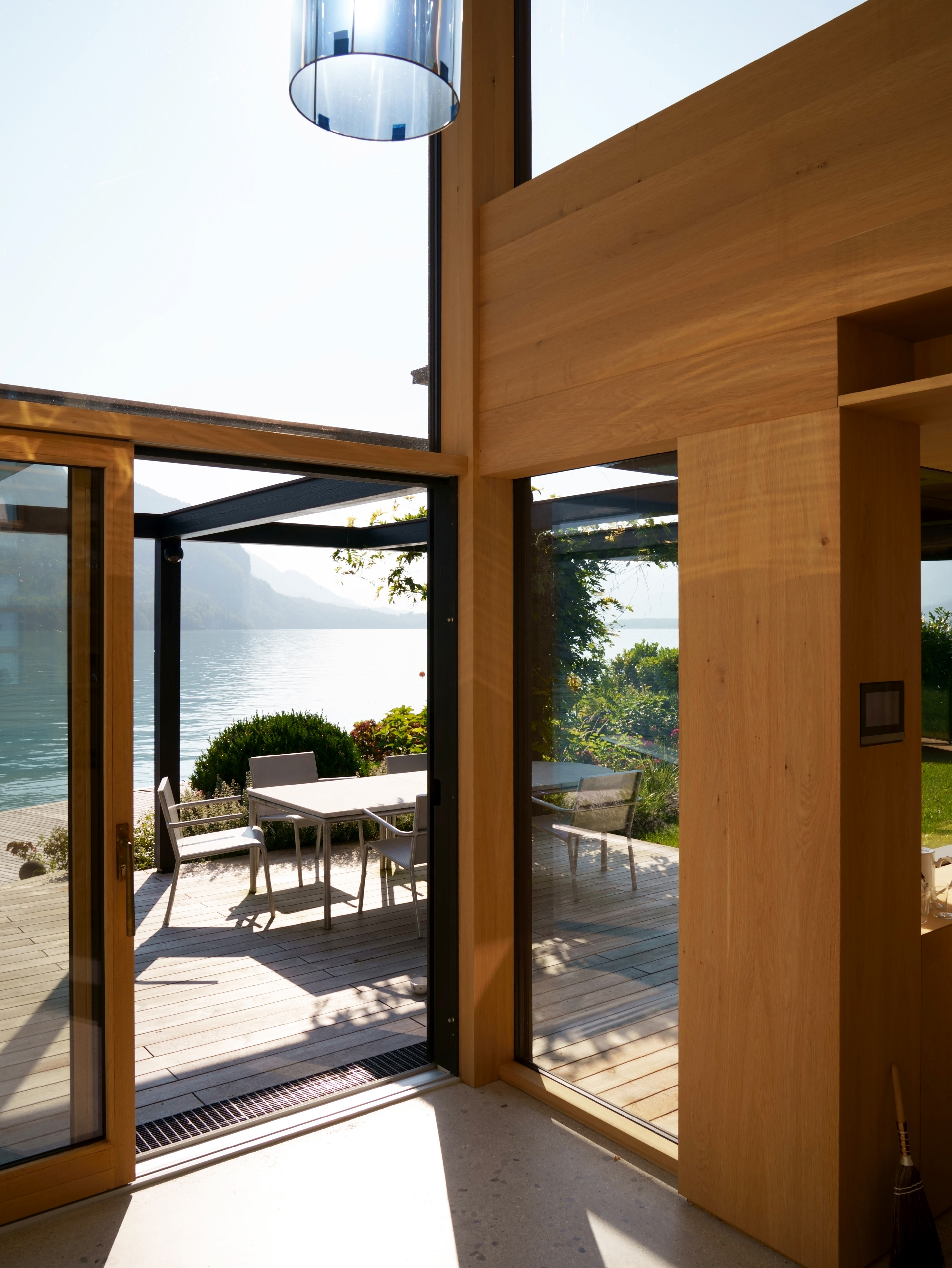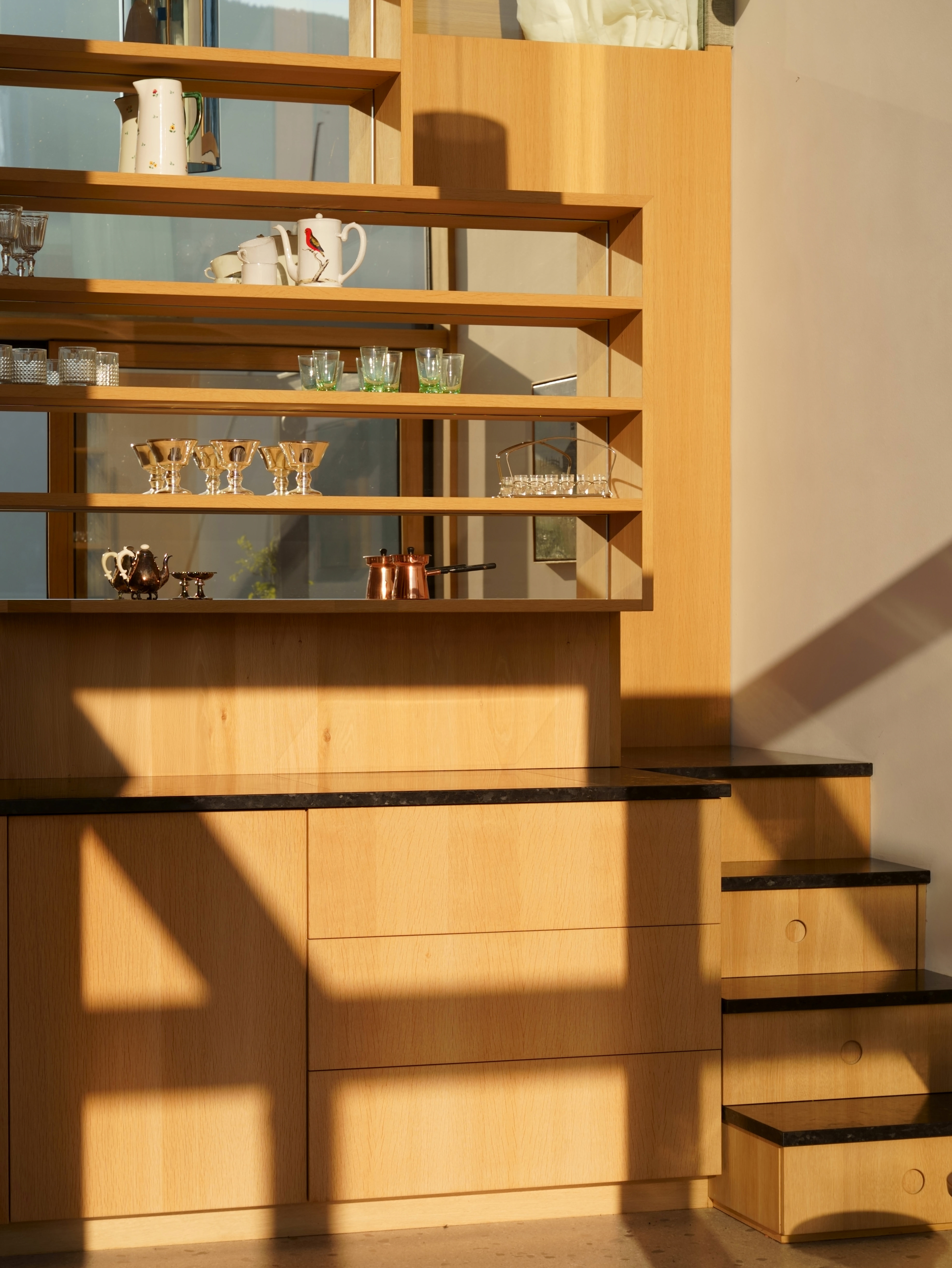 The office for Cute Concerts is trenched in navy blue and coral. A softly clad gallery for shoeless working and informal meetings hovers above the main space, which features a large communal table, custom-made to fit the compact footprint. The kitchen is tucked into the corner, bulging out into a cozy coffee table—squeezing comfort into function. A cute design for a cute team. Rupert Zallmann