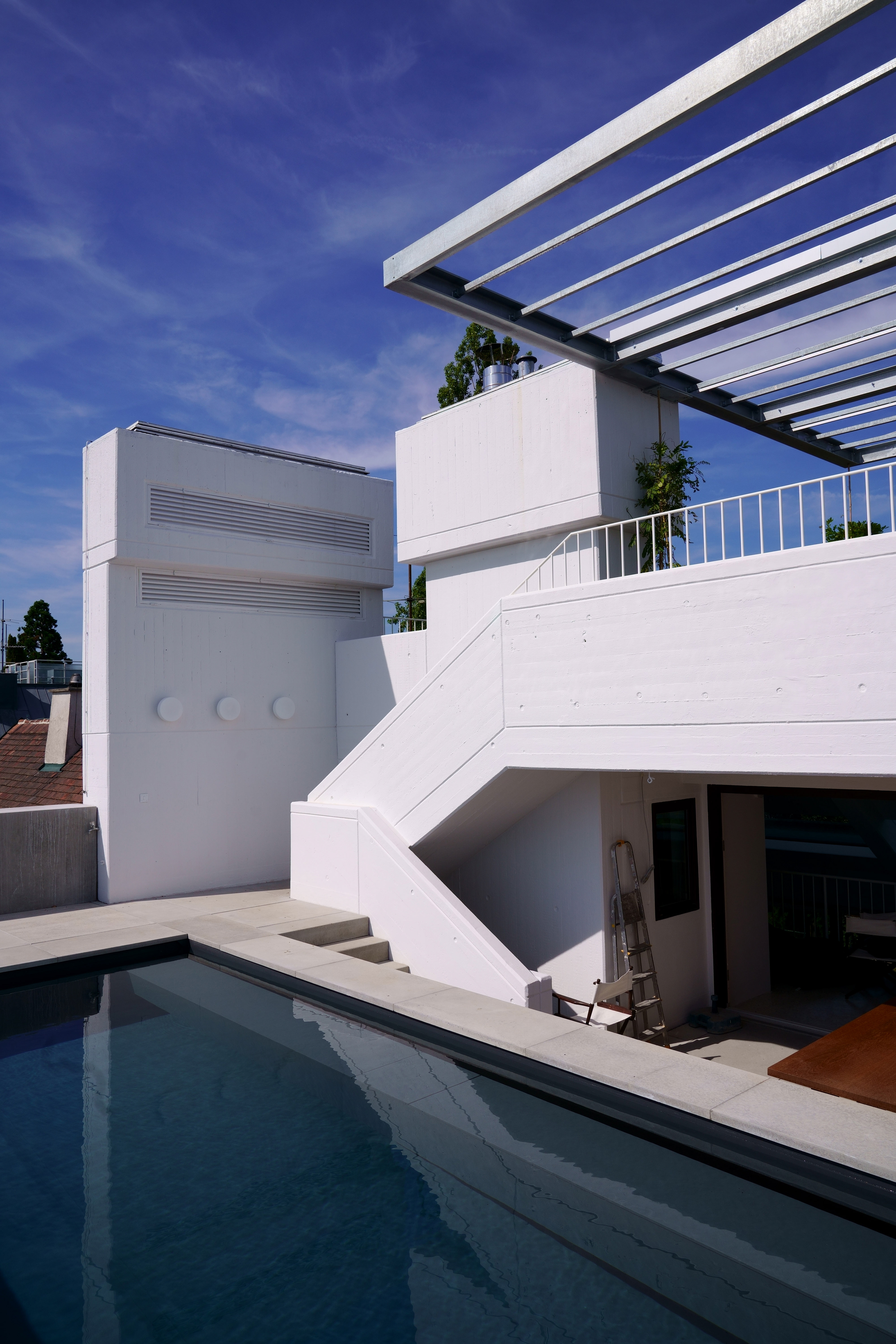 Ascending a path of split levels, the renovation of this 1970s brutalist multi-family house transforms each floor into its own realm by removing internal walls and hallways. The staircase, now the central artery, guides movement through the space. Once hidden beneath plaster, the raw, expressive concrete from the exterior now breathes inside, its rugged texture mirrored by the grain and format of ash flooring, echoing the wood once used in the concrete's formwork. Textiles soften the hard lines, selected to harmonize with the concrete's cool tones. Furniture is custom-crafted, while fixed walls have given way to a fluid architecture of curtains, sliding partitions, folding elements, and concealed doors—some hidden in plain sight, disguised as bookshelves. Even the kitchens retreat from view, disappearing behind seamless walls, allowing the space to evolve and shift according to the needs of those who dwell within. Spiraling upwards through the split levels, one ascends to a terrace that unveils a serene rooftop garden, where a regenerative landscape meets a swimming pool overlooking Vienna. A pergola stands as shelter for a grand, suspended bed—an intimate retreat poised high above the city. Here, from this secluded haven, one can sway gently while gazing over the vast expanse, a hideaway that embraces the rhythm of the sky and the skyline below. Rupert Zallmann