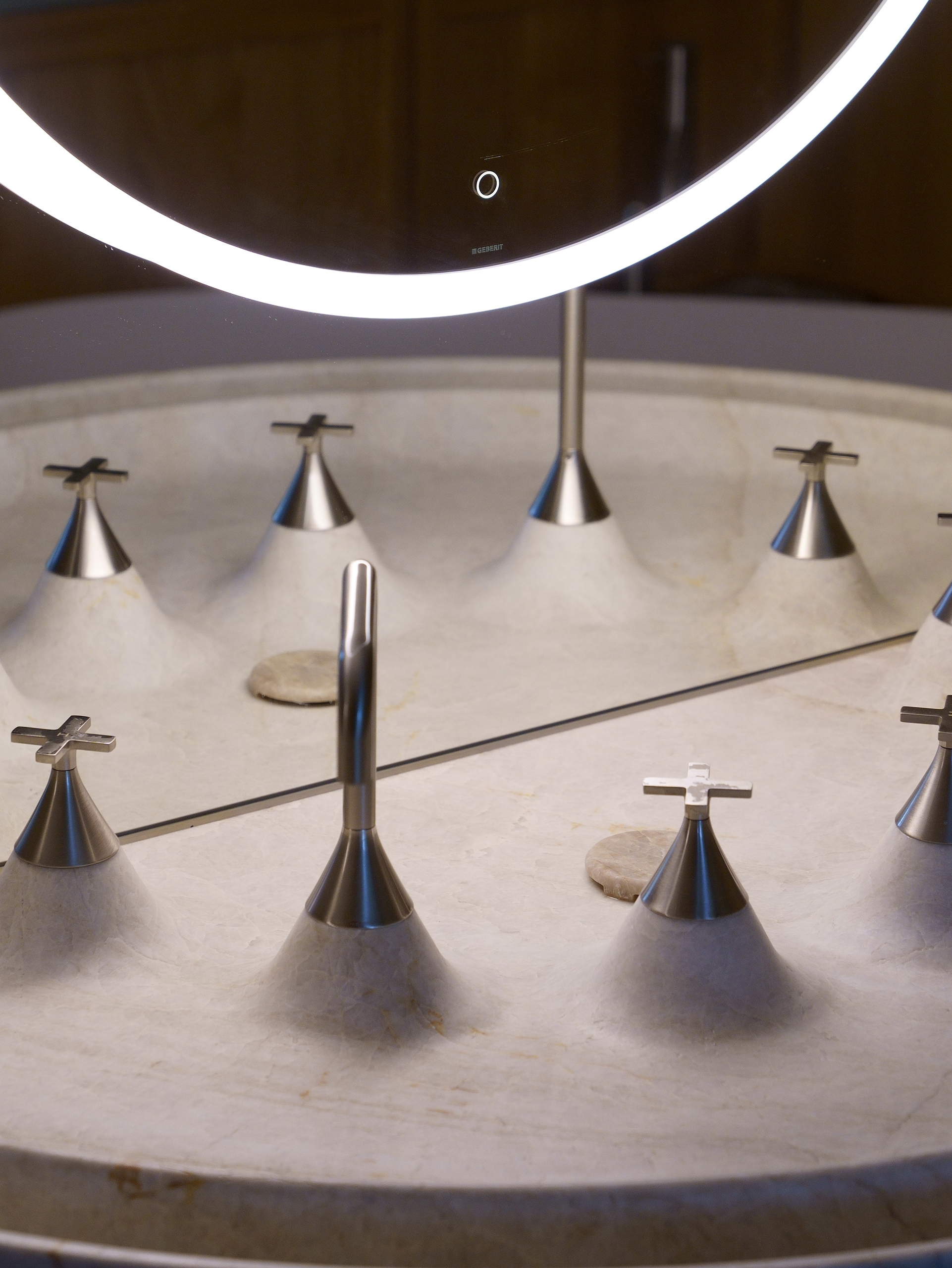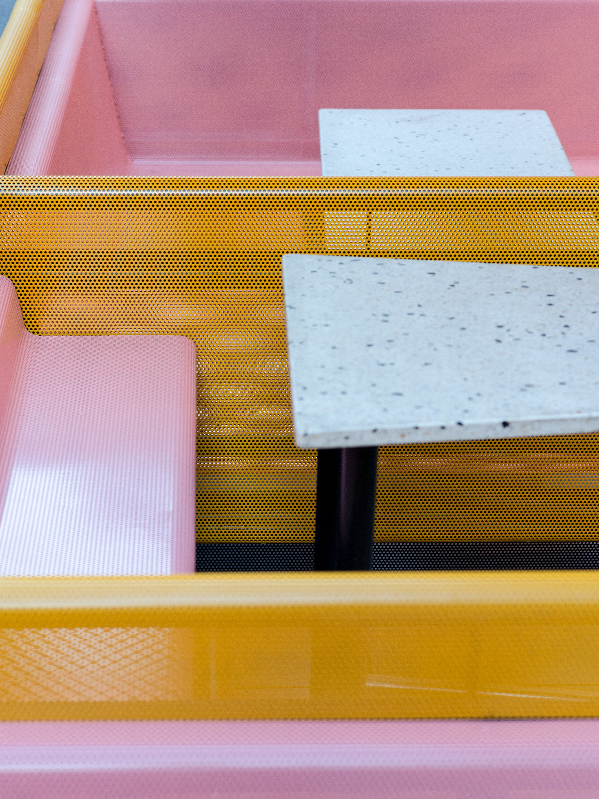 The fusion of corner shop and fine dining is made possible through the design of a continuous, flowing table that seamlessly transitions from cashier counter to shop display to fine dining surface. This uninterrupted element connects the different aspects of the space, creating a sense of unity between the casual and the refined, and inviting guests to move fluidly between shopping and dining. The design enhances the culinary experience by engaging all the senses, turning a simple visit into a memorable journey. Perforated metal sheets, custom-designed for the shelving, allow light to filter through, casting subtle patterns that highlight the products on display. This interplay of light and shadow creates a dynamic backdrop that makes the goods feel almost curated, as if each item is part of the overall design. The pillars, clad in sleek black tiles with smooth edges, are accented by a vibrant yellow grout, adding a playful contrast and warmth to the space. This combination of materials brings together the practicality of the corner shop and the sophistication of a fine-dining environment, resulting in a space that feels both grounded and elevated. It’s a thoughtful blend of function and aesthetics, aimed at delivering an experience that resonates beyond taste alone. Rupert Zallmann