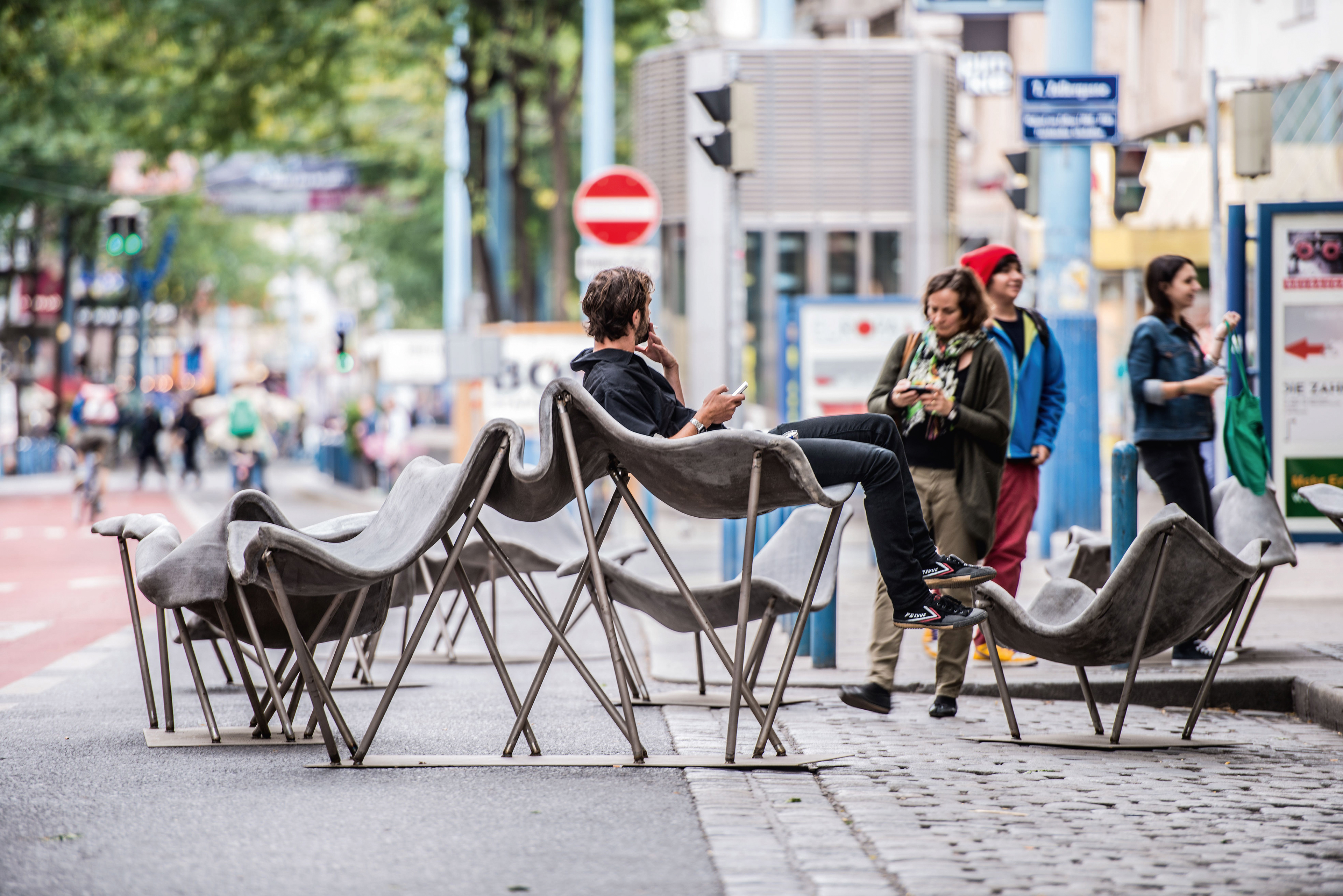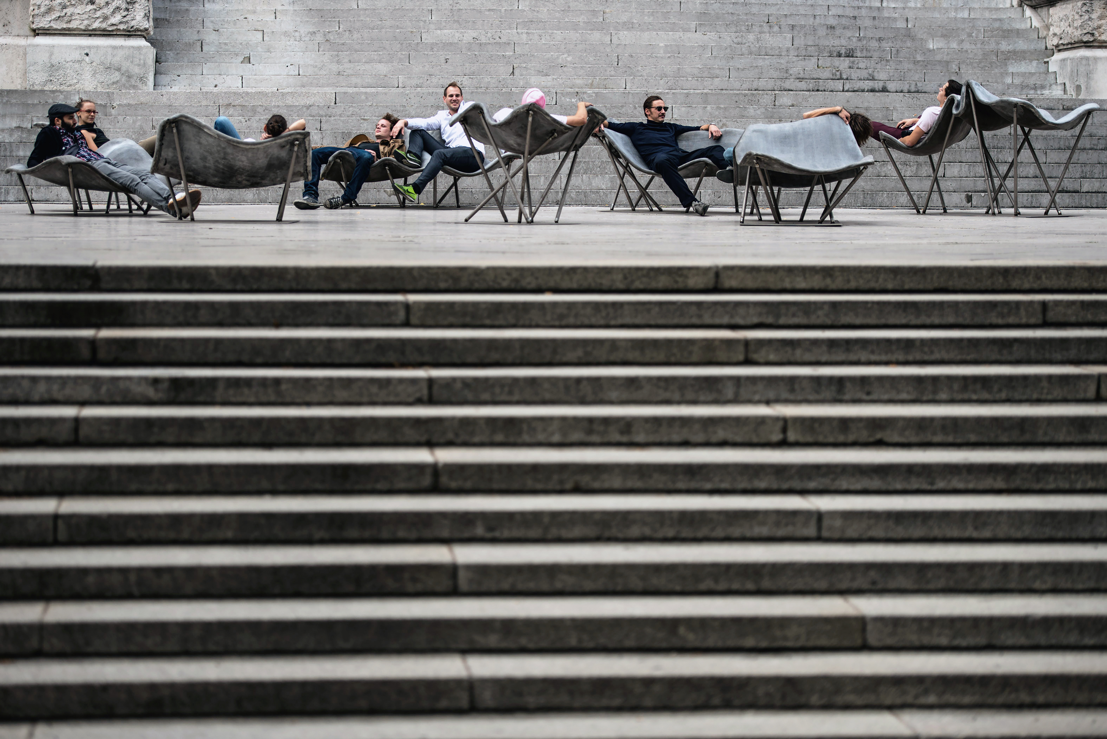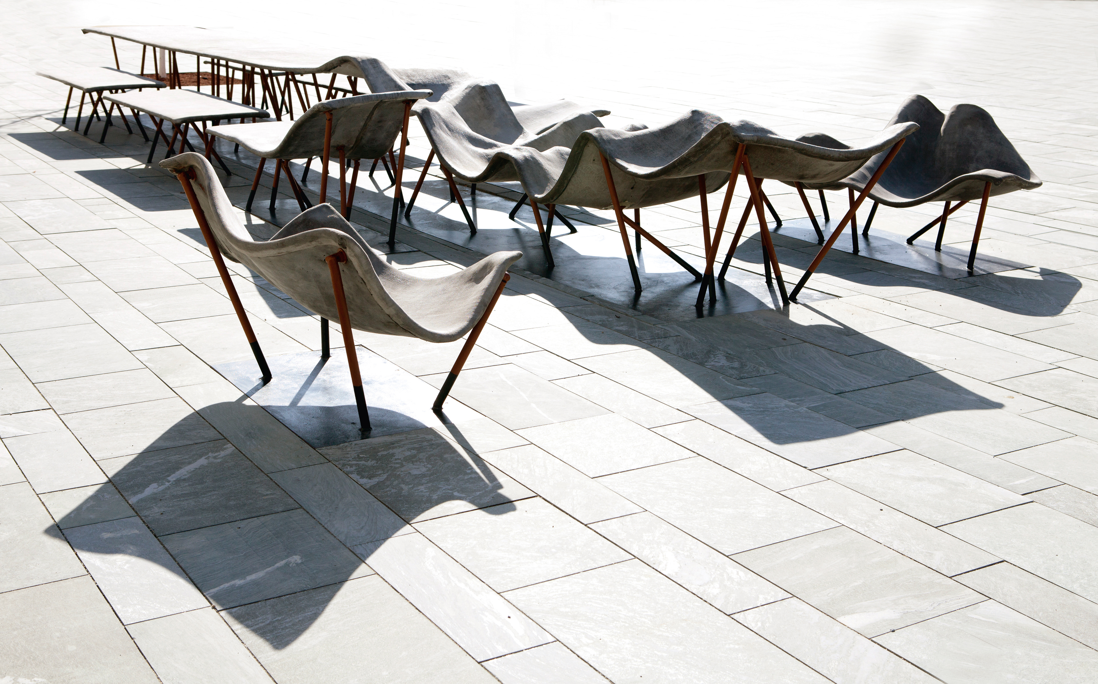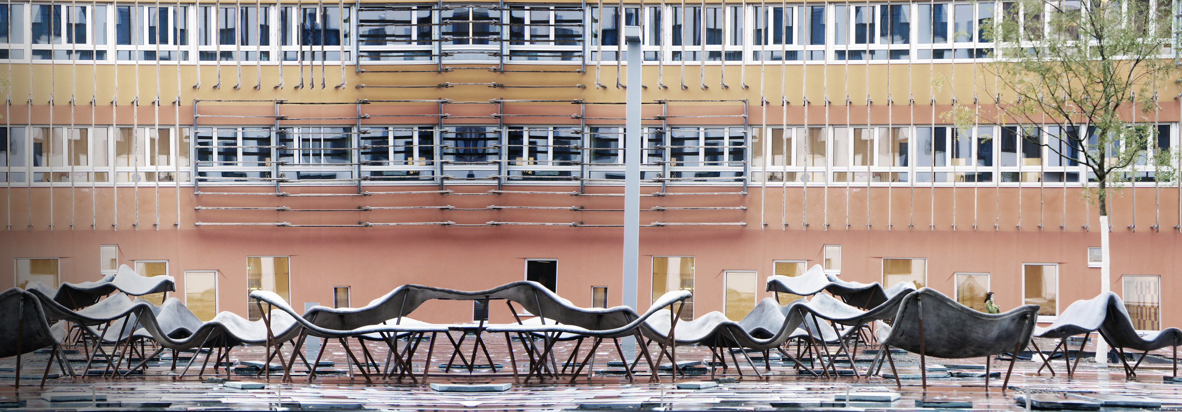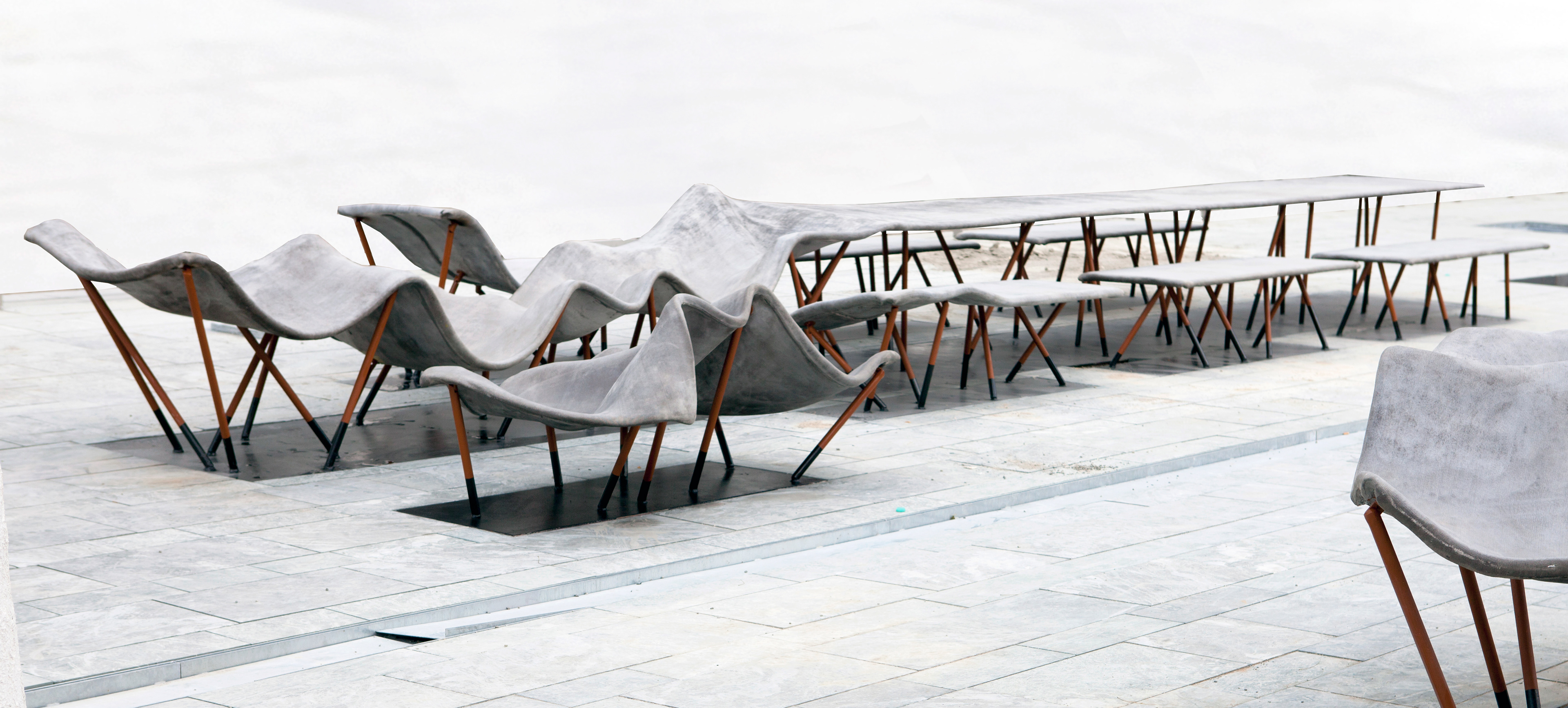 Design and construction of permanent outdoor furniture for the new WU Campus in Vienna involved creating 30 square meters of seating from textile concrete. The flat surface of the large table gradually transforms into wave-like forms toward the east, generating a variety of soft, undulating shapes that invite people to sit or lie down, making it equally suited for moments of relaxation or lively discussions. The concrete structures, made from concrete canvas, are supported by a "forest" of steel stanchions that mirror the direction and length of the surfaces above, enhancing the overall effect of dissolution and fluidity. This interplay of materials and forms creates an engaging and dynamic public space. August Kocherscheidt & Rupert Zallmann
