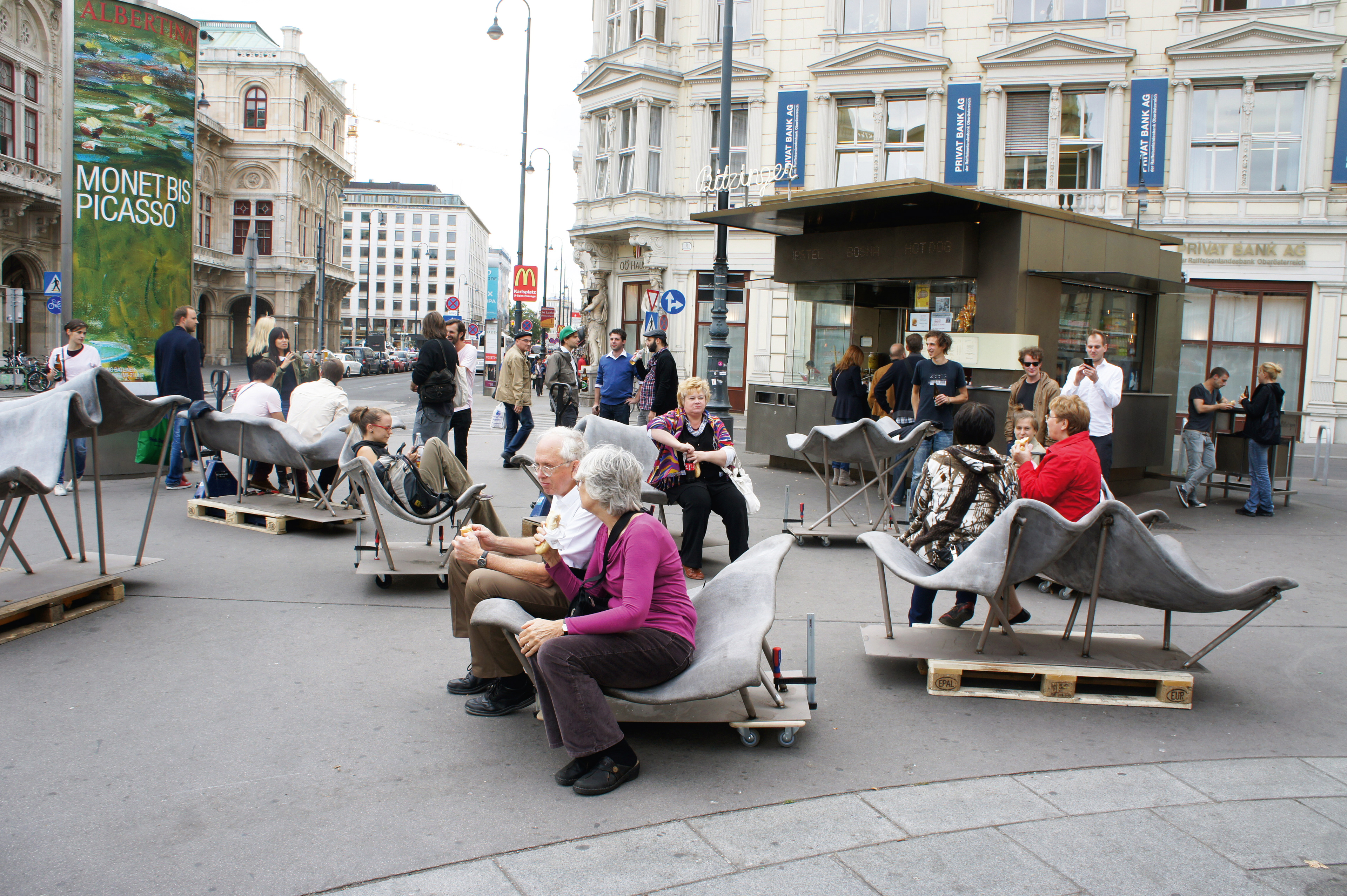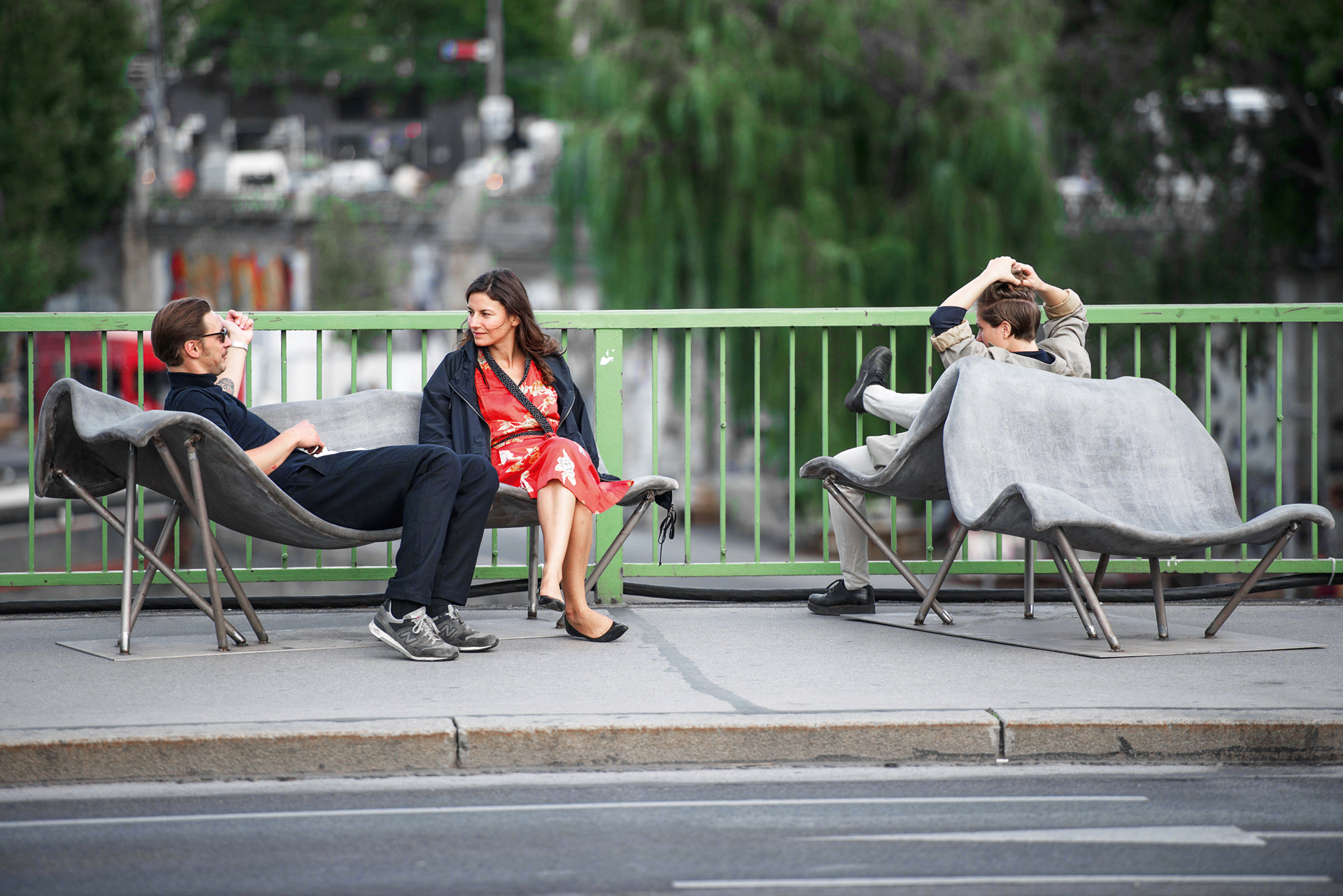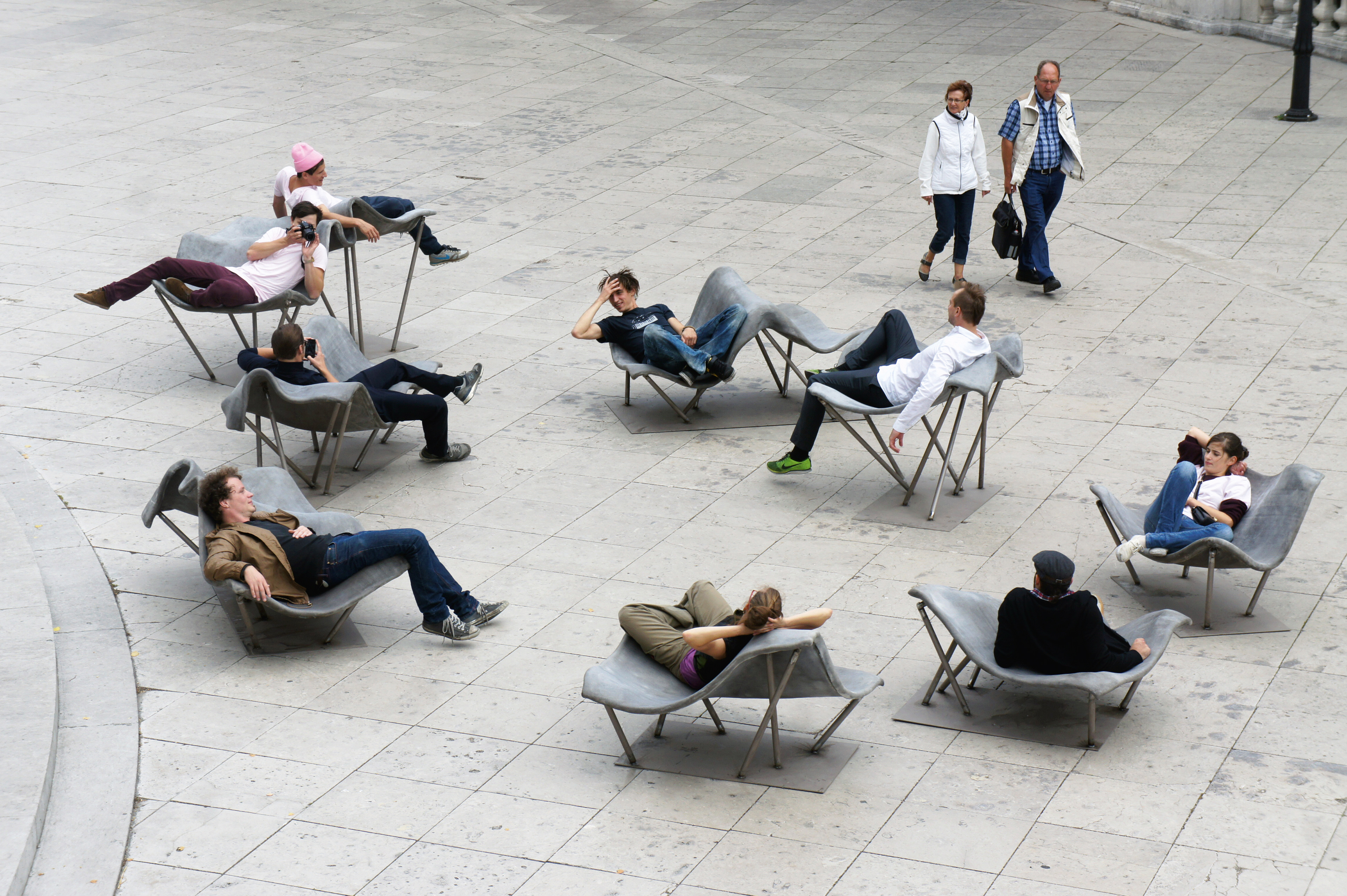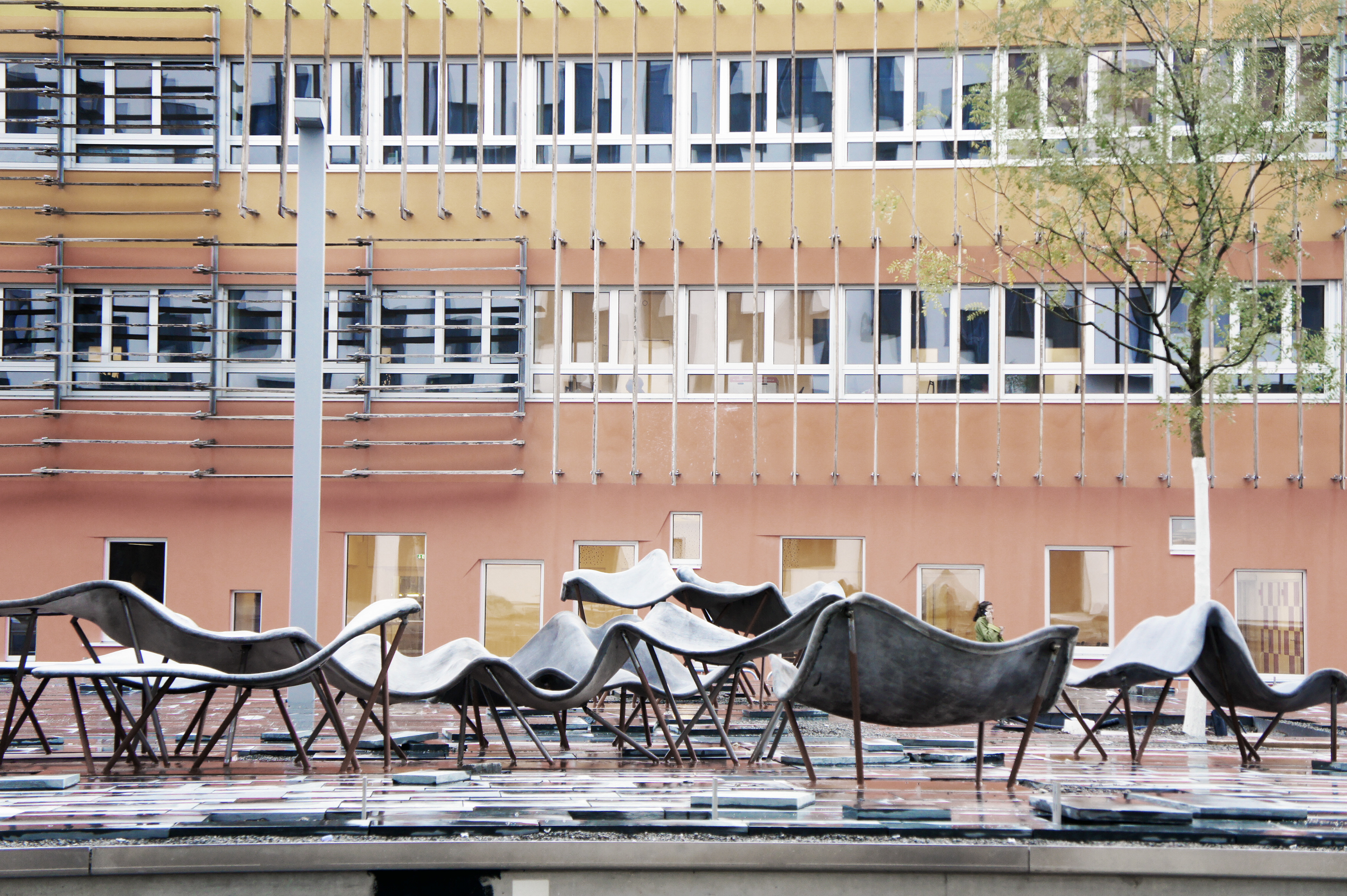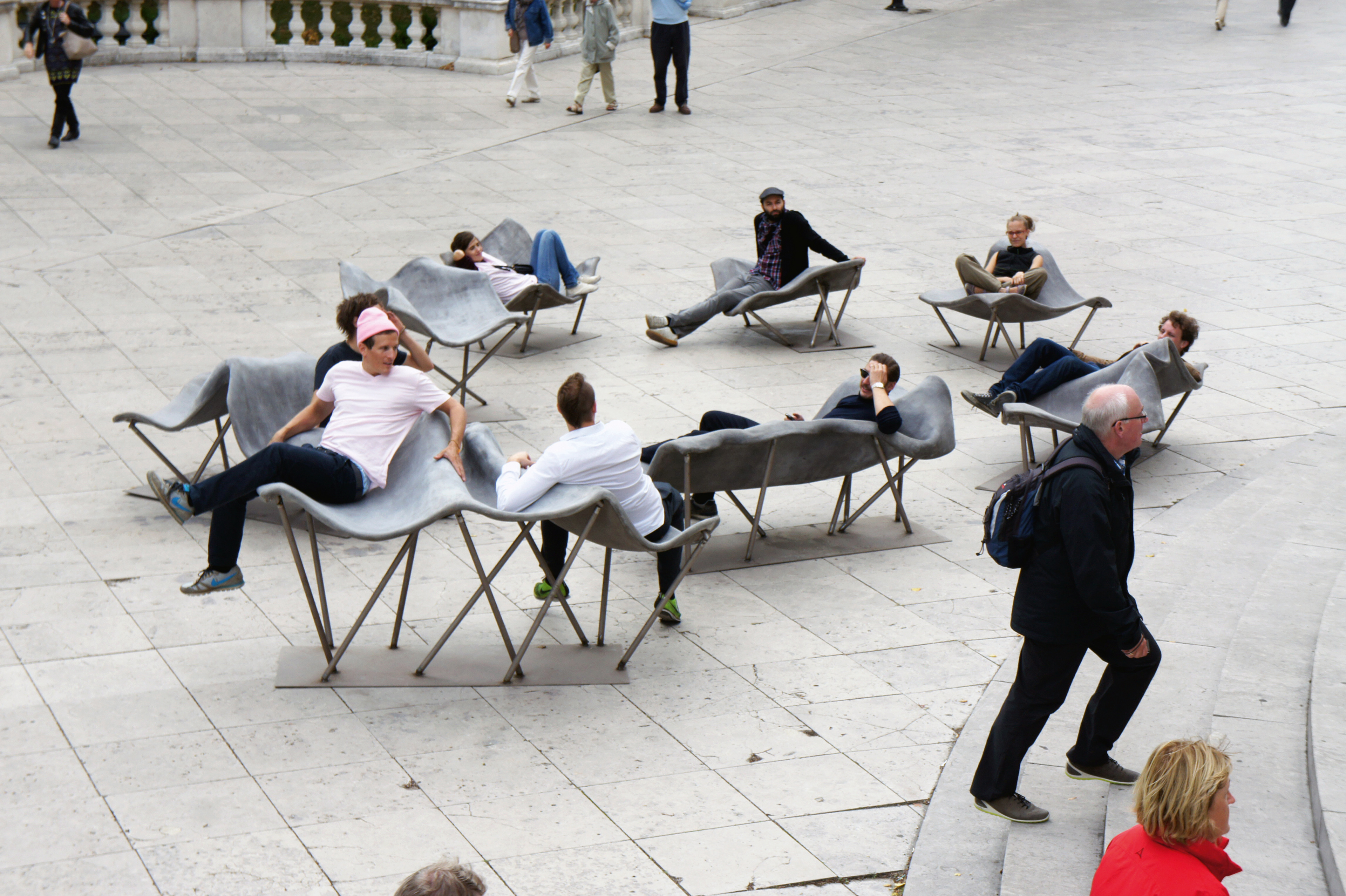 Design and construction of permanent outdoor furniture for the new WU Campus in Vienna involved creating 30 square meters of seating from textile concrete. The flat surface of the large table gradually transforms into wave-like forms toward the east, generating a variety of soft, undulating shapes that invite people to sit or lie down, making it equally suited for moments of relaxation or lively discussions. The concrete structures, made from concrete canvas, are supported by a "forest" of steel stanchions that mirror the direction and length of the surfaces above, enhancing the overall effect of dissolution and fluidity. This interplay of materials and forms creates an engaging and dynamic public space. August Kocherscheidt & Rupert Zallmann