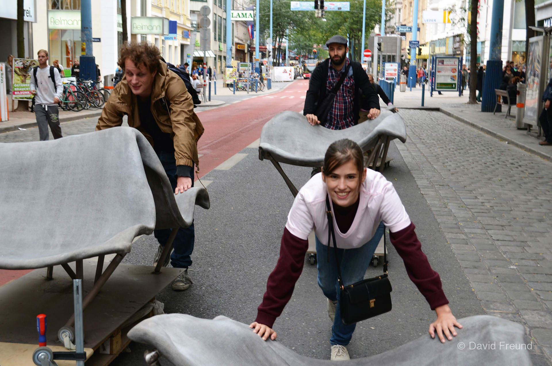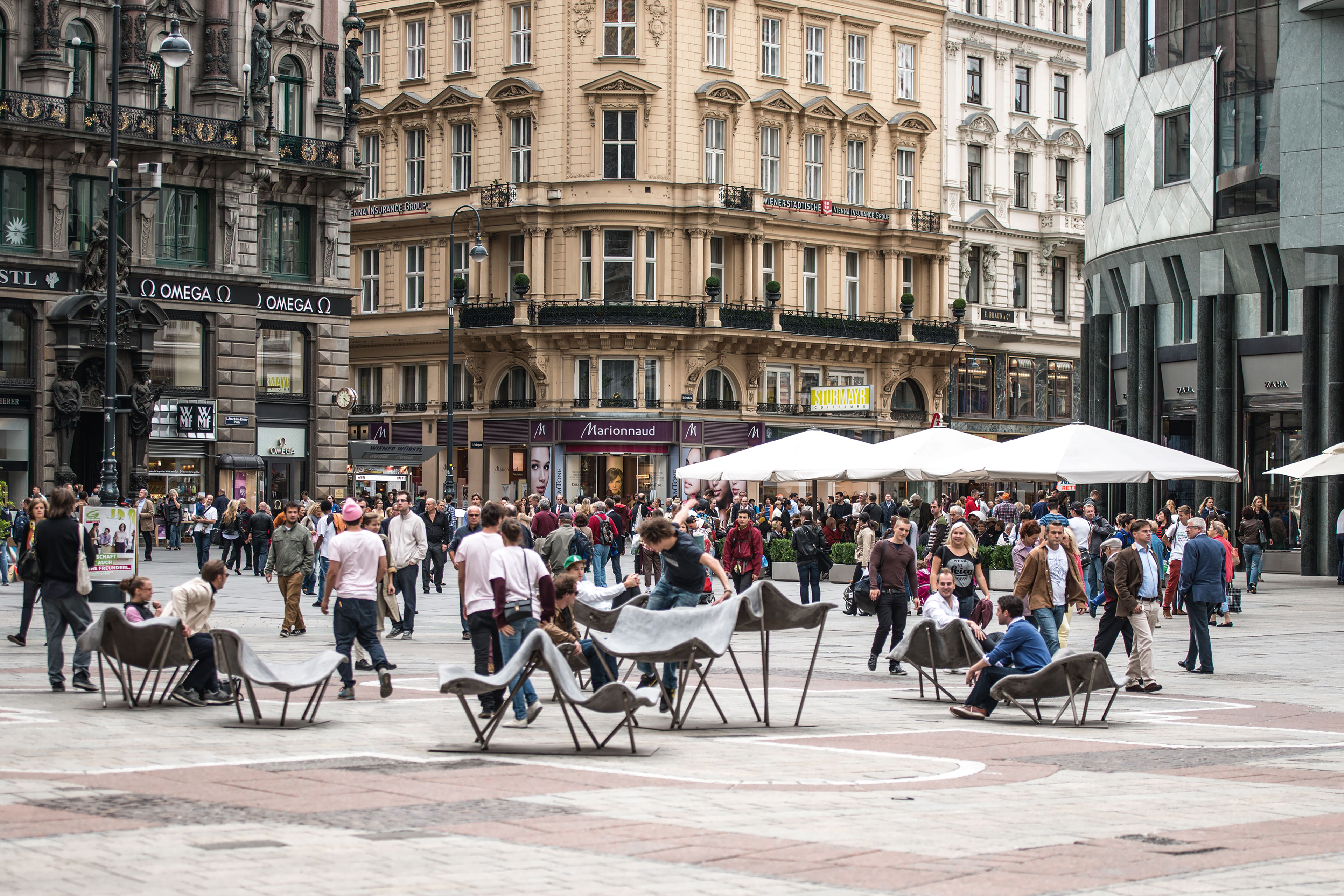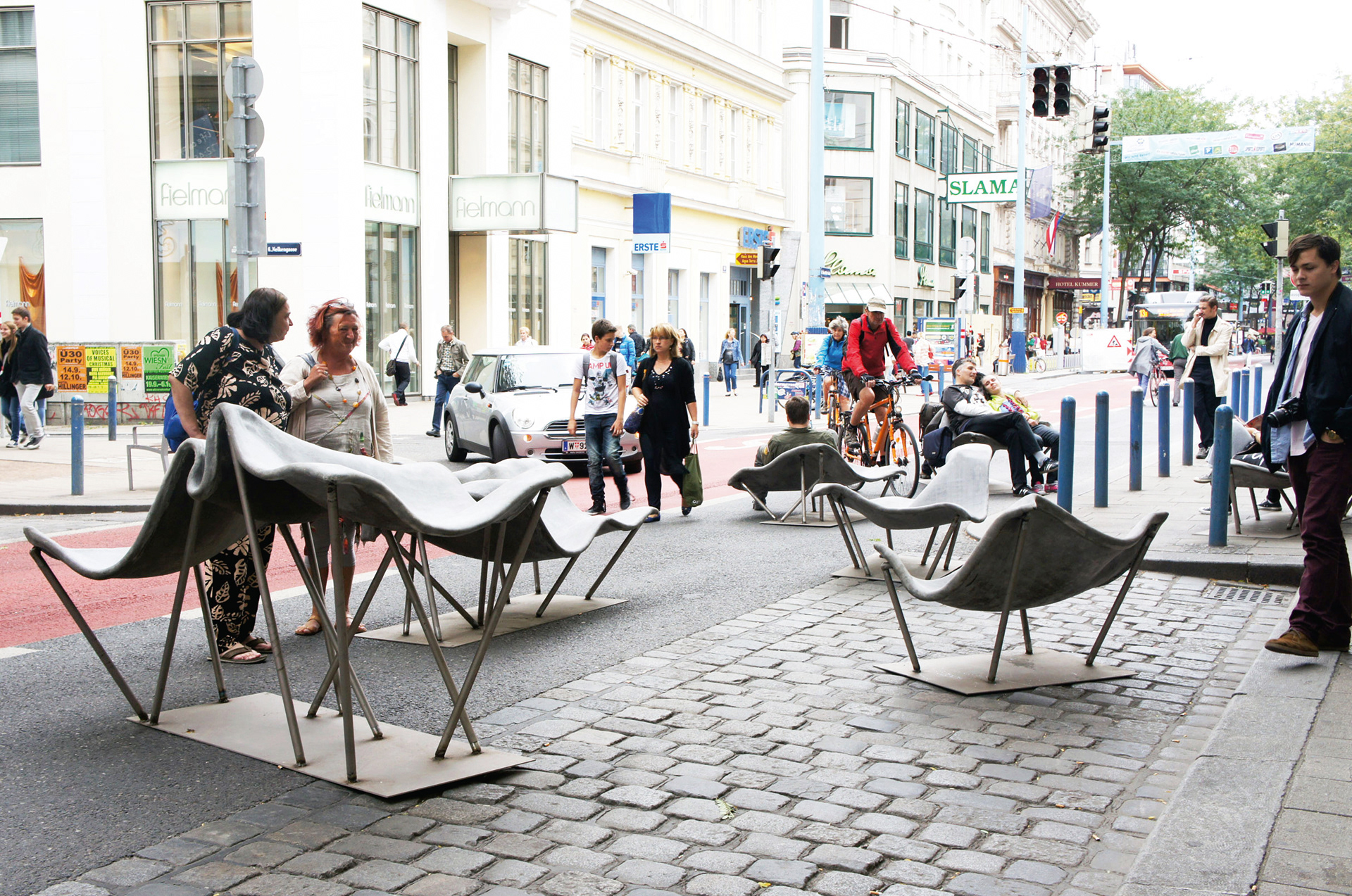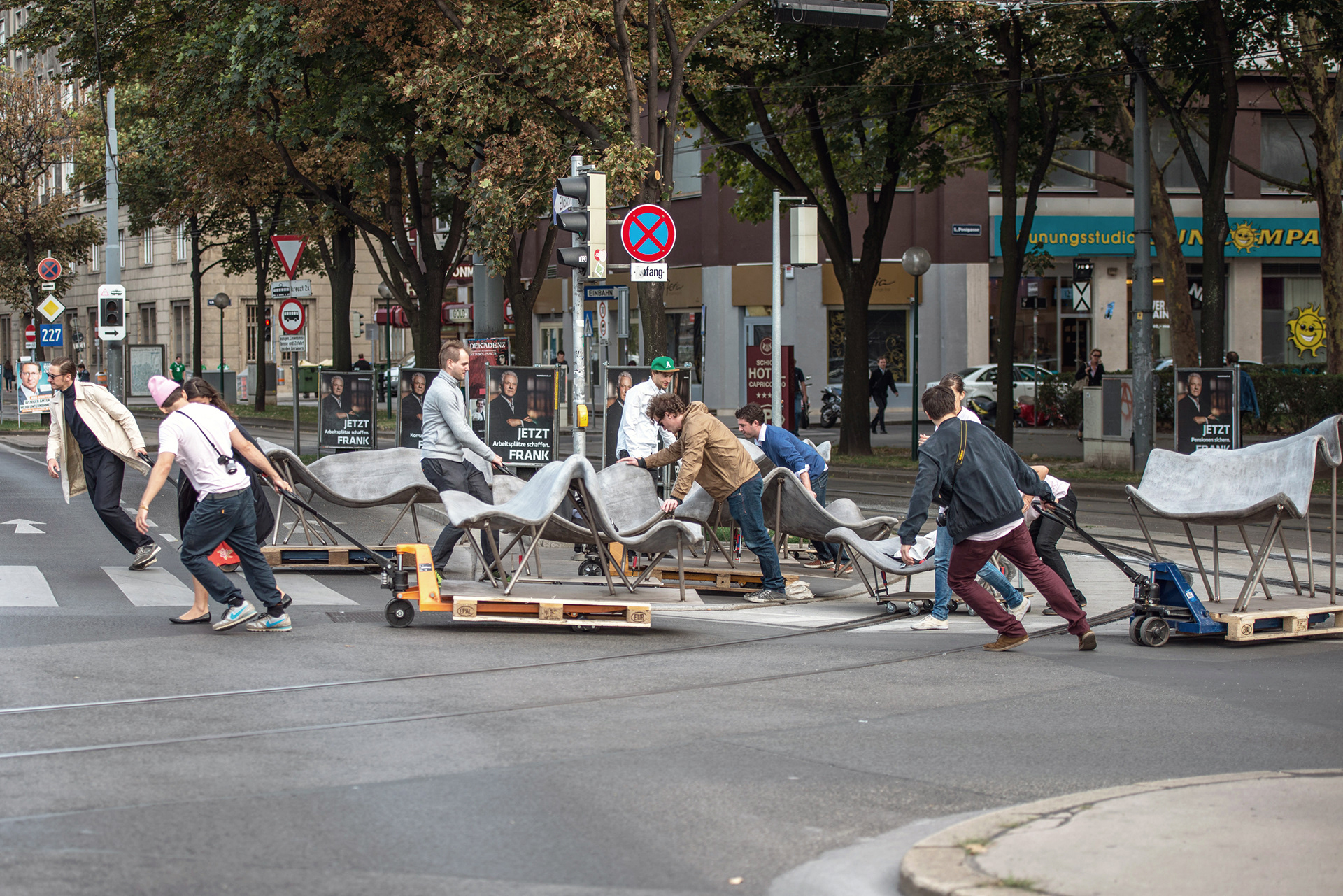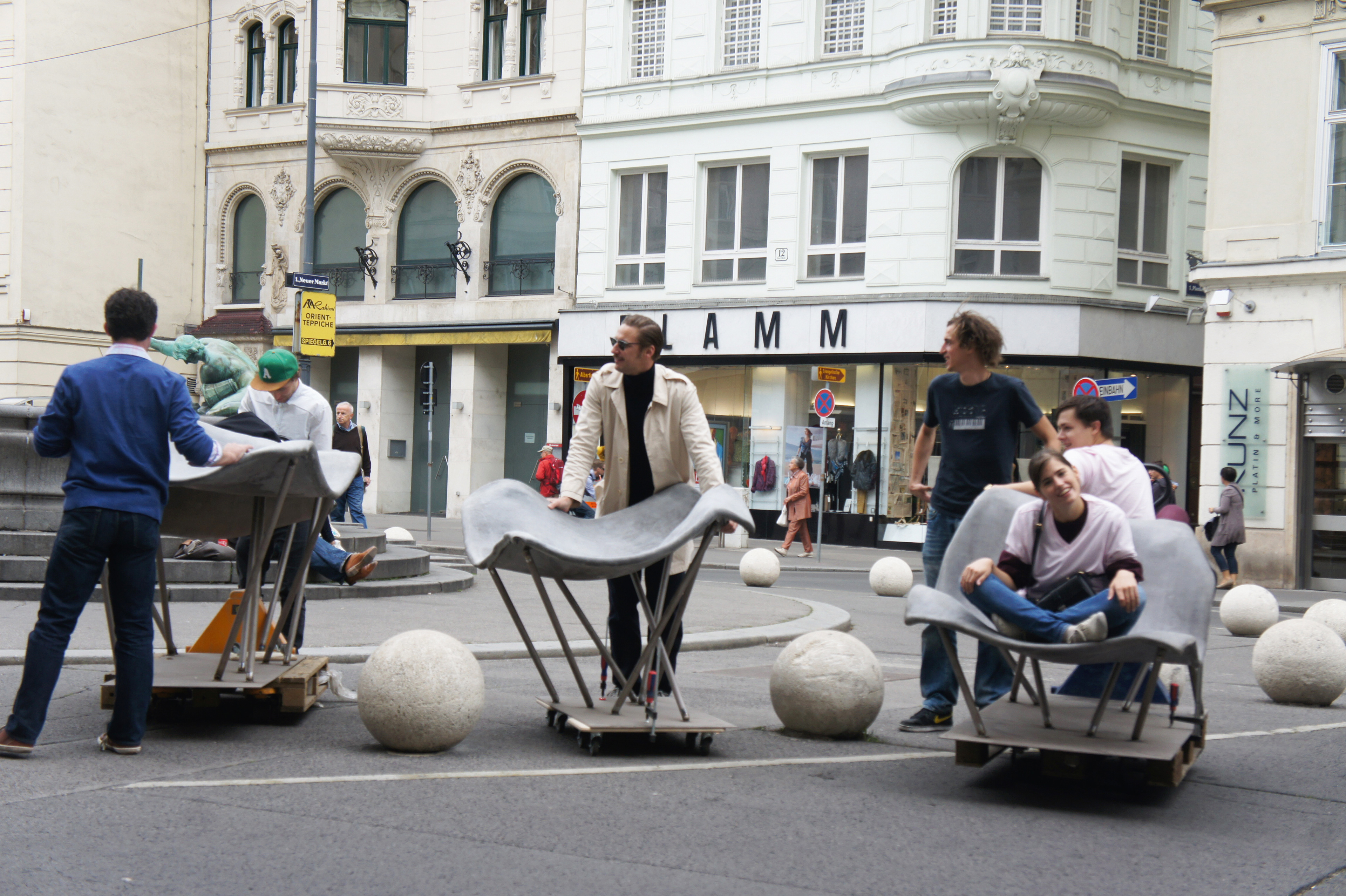 Design and construction of permanent outdoor furniture for the new WU Campus in Vienna involved creating 30 square meters of seating from textile concrete. The flat surface of the large table gradually transforms into wave-like forms toward the east, generating a variety of soft, undulating shapes that invite people to sit or lie down, making it equally suited for moments of relaxation or lively discussions. The concrete structures, made from concrete canvas, are supported by a "forest" of steel stanchions that mirror the direction and length of the surfaces above, enhancing the overall effect of dissolution and fluidity. This interplay of materials and forms creates an engaging and dynamic public space. August Kocherscheidt & Rupert Zallmann